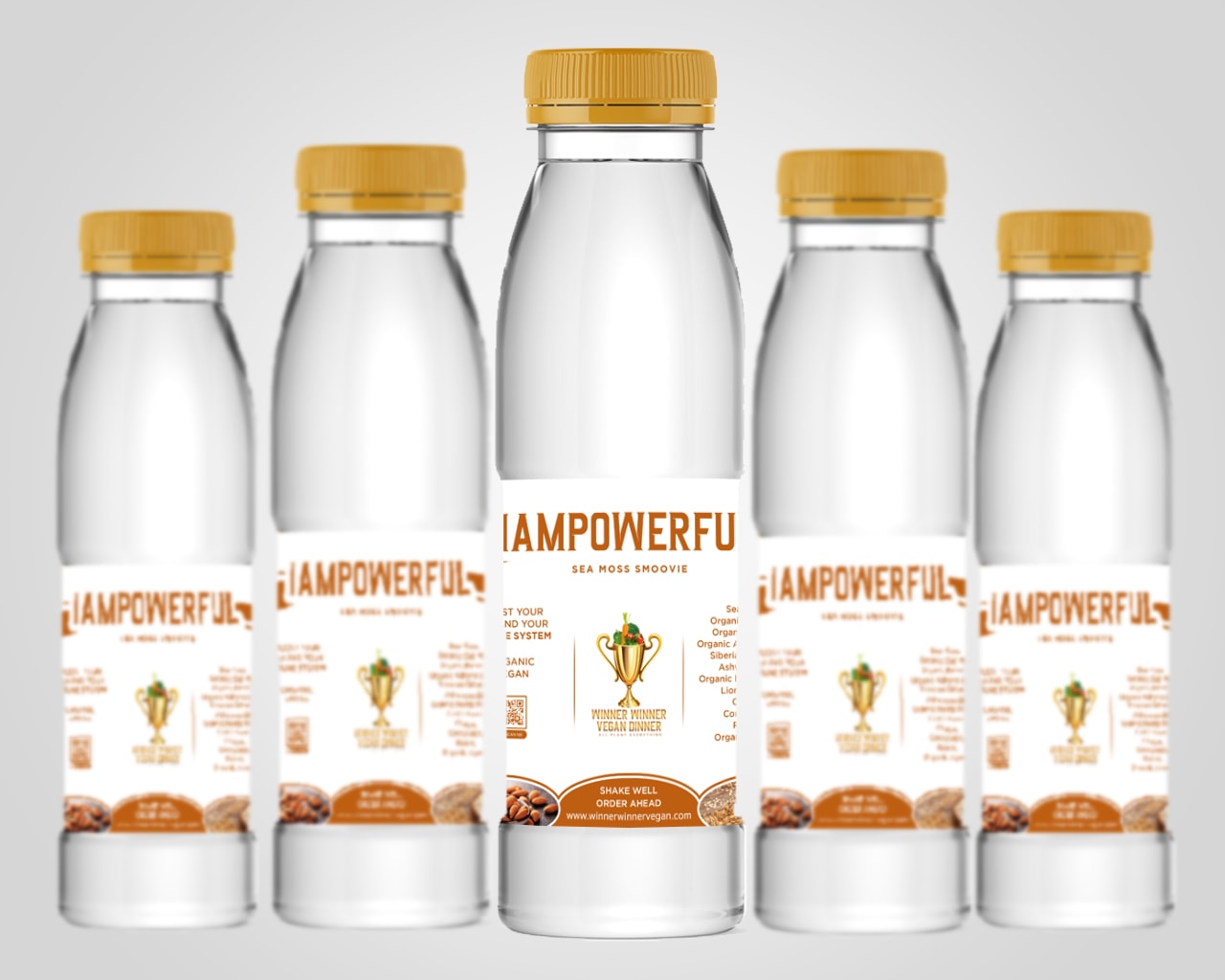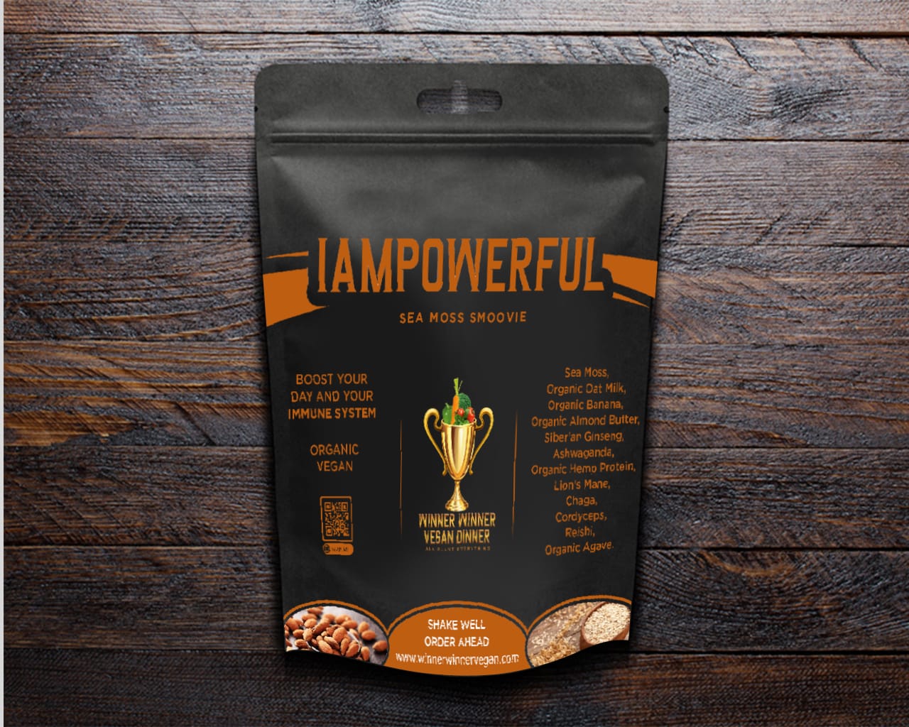 Winner Winner Vegan’s Power Sea Moss Smoovie Blend for Strength and Endurance With Sea Moss, Organic Bananas, Organic Almond Butter, Organic Hemp Protein, Siberian Ginseng, Ashwaganda, Lion’s Mane, Reishi, Cordyceps, Chaga, Organic Oatmilk, and Organic Agave.